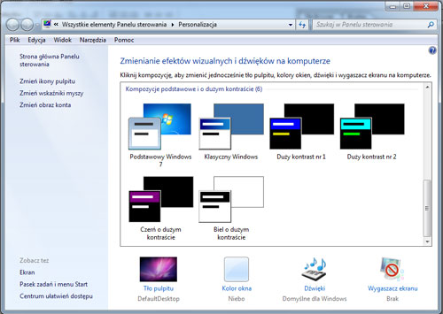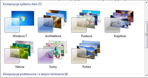 Tradycyjnie jak to ma miejsce w systemie Windows 7 w prawej części wyświetlonego okna znajdują się funkcje powiązane z personalizacją w Windows 7. W prawym menu znajdują się takie funkcje jak: Zmień ikony pulpitu – funkcja umożliwia zmianę głównych ikon systemu Zmień wskaźniki myszy – jak nie przypadł nam do gustu tradycyjny wskaźnik myszy można go zmienić na dowolny inny Zmień obraz konta – zmiana obrazu, który wyświetlany jest między innymi podczas logowania do systemu Natomiast w dolnym menu personalizacji w Windows 7 jest możliwość zmiany tapety na pulpit, koloru okien, domyślnych dźwięków systemu Windows 7 oraz ustawienie wygaszacza. Personalizacja w Windows 7 umożliwia zmianę wyglądu systemu. Możliwości zmiany wyglądu systemu zostały podzielone na trzy kategorie: Moje kompozycje – są to kompozycje ustawiane przez użytkownika systemu nie występujące oryginalnie w systemie Windows 7 Kompozycje systemu Aero – są to kompozycje z wszystkimi efektami pulpitu takimi jak przezroczystość. Kompozycje podstawowe i o dużym kontraście – są to kompozycje, które używane są w przypadku kiedy komputer nie spełnia wymagań sprzętowych systemu Windows 7 lub jeśli użytkownik woli tradycyjny wygląd systemu jak w Windows 98.